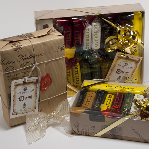 Confezione trasparente grande di torroni assortiti.